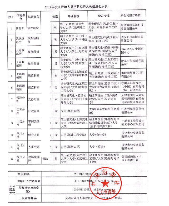 山东:2017年06月中国船级社有经验人员招聘拟聘公示