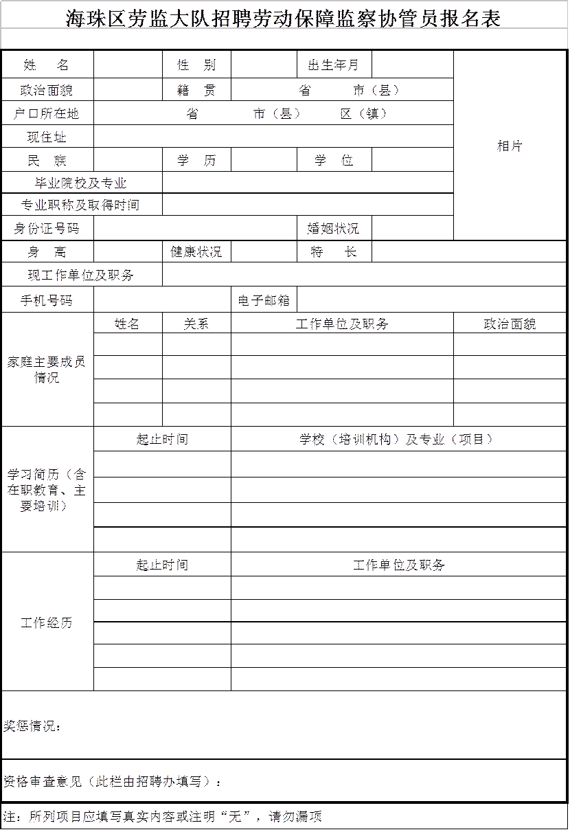 报名人员请下载附件《海珠区劳监大队招聘劳动保障监察协管员报名表》,填写后打印一式两份,于2013年8月26日—8月30日(上午9时-12时,下午14时-17时)到区劳动保障监察大队(海珠区宝岗大道1099号)报名及资格审核。需报名人员本人到场,并提供户口本、身份证、毕业证原件及复印件和小一寸正面免冠证件彩照1张。