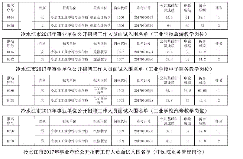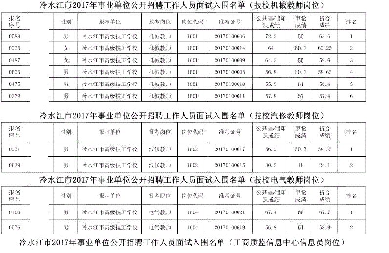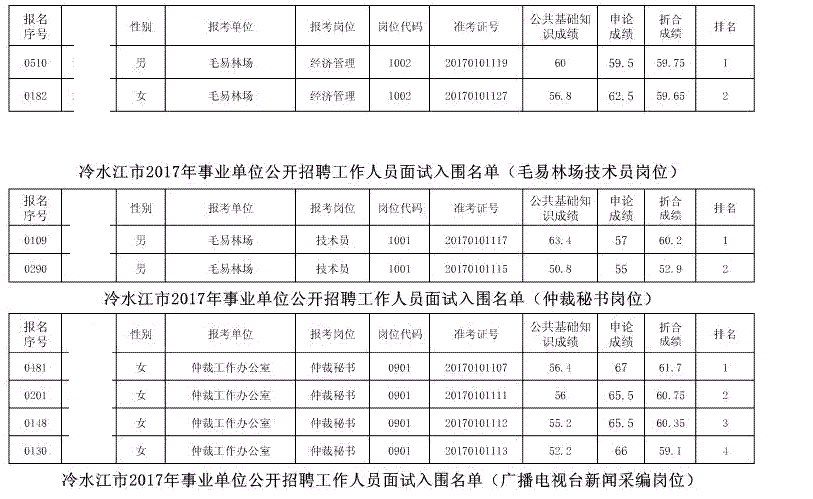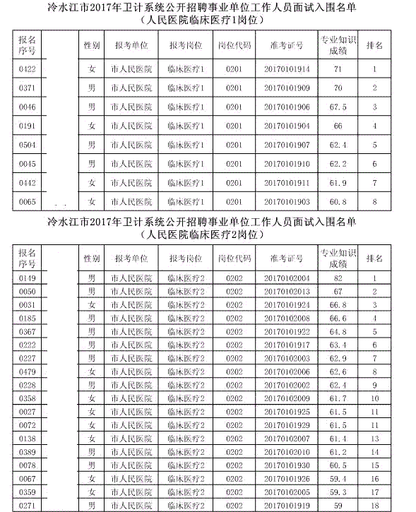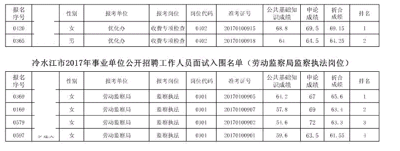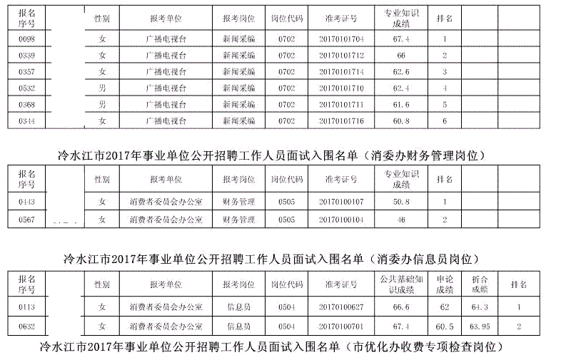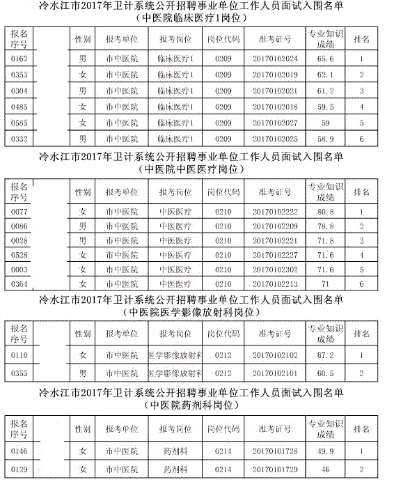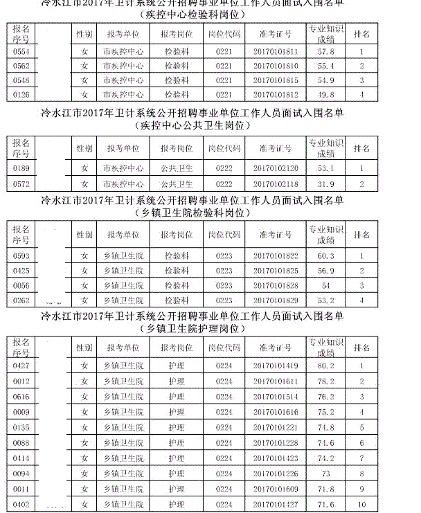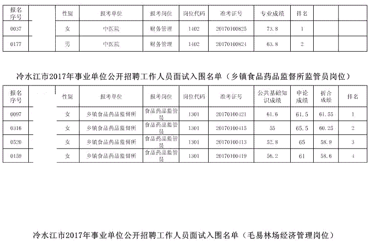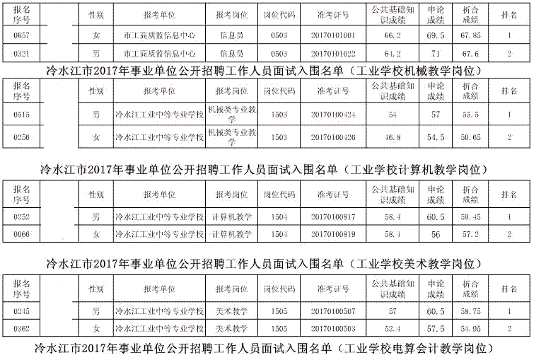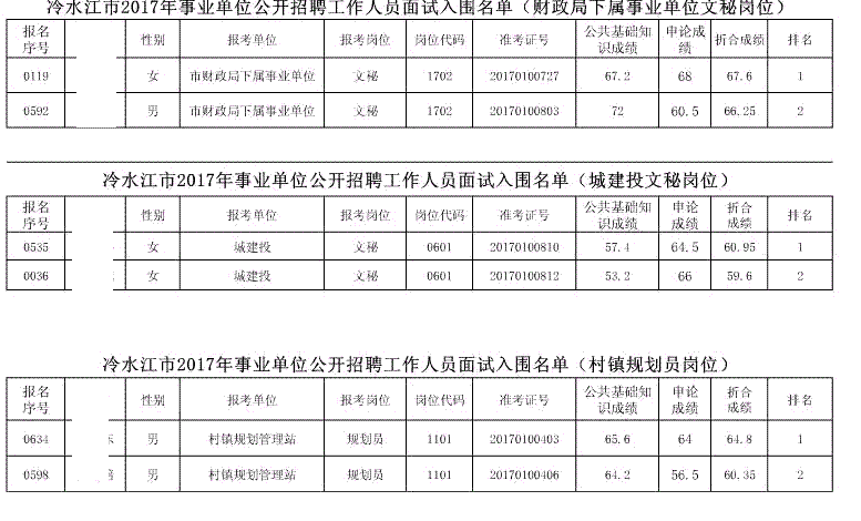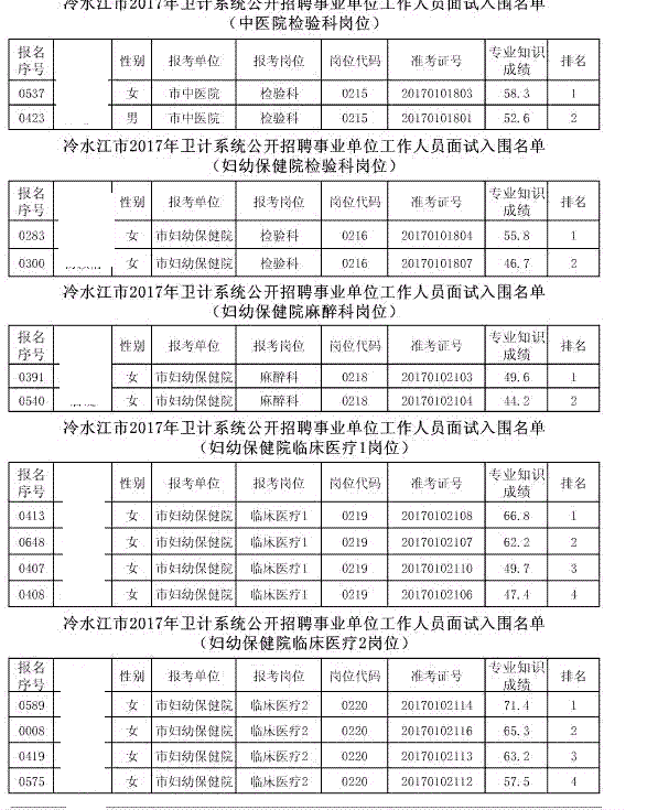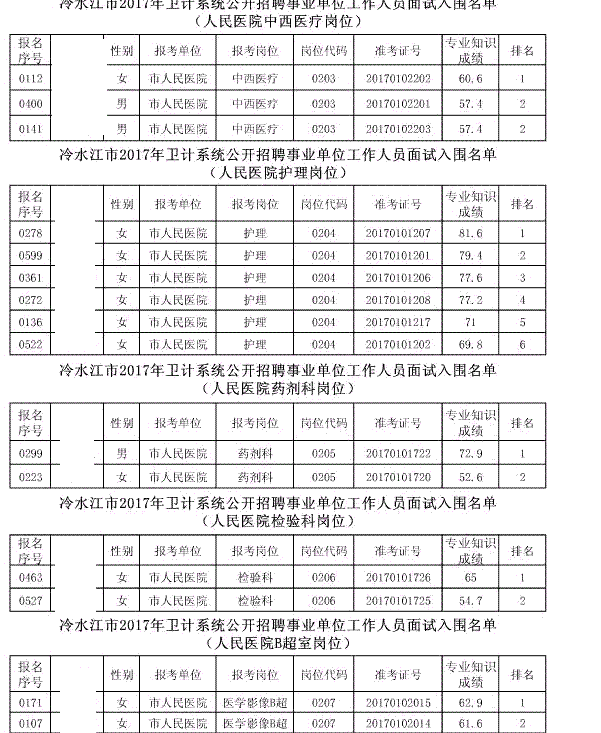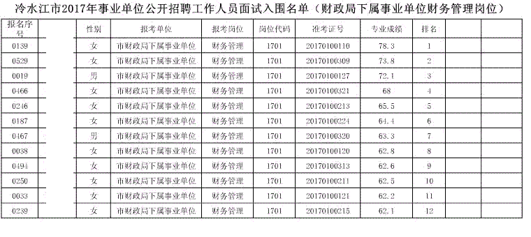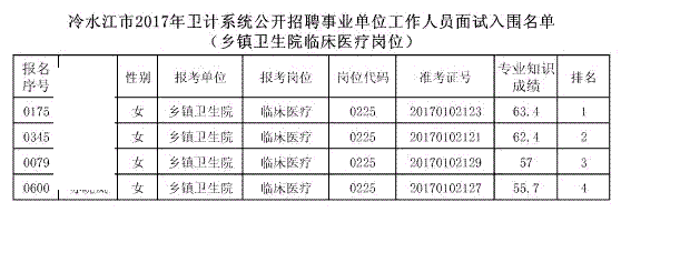 现将冷水江市2017年公开招聘事业单位工作人员(含卫计系统)面试入围名单予以公布(详见以下附表)。