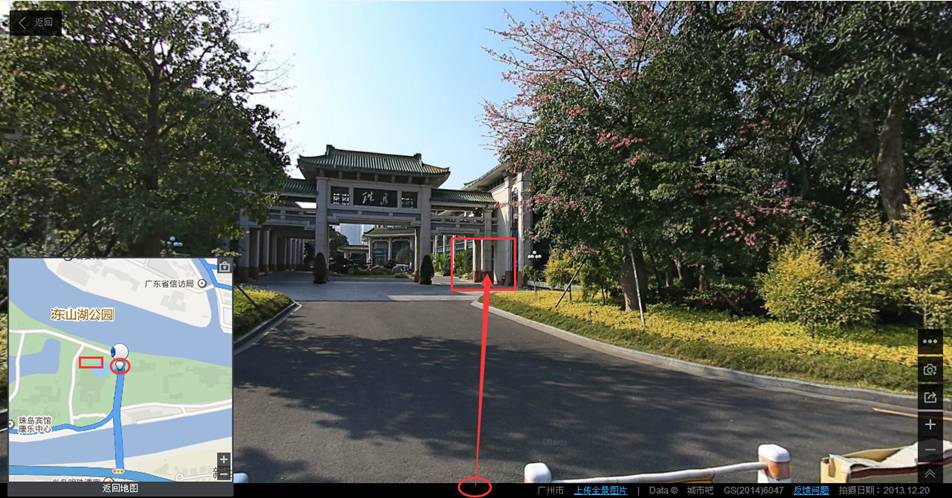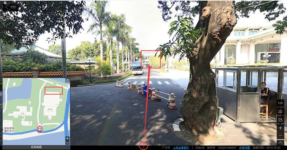 图3:面试地点现场指示图1(由南往北看,红圈为图片拍摄所在点,红色方框区即为面试地点)。图片来源:百度地图全景图片网站