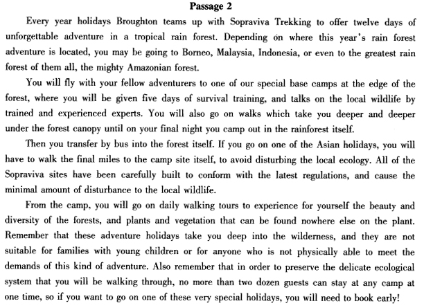 【答案】D。专家解析:根据题干关键词goon the camp和first定位在文章最后一段末句,句意为“如果你想参加其中一个非常特殊的假日(野营),就需要提早预订”。所以D项“提前预订”为正确答案。其他三项均不是参加者首先要做的事,故排除。