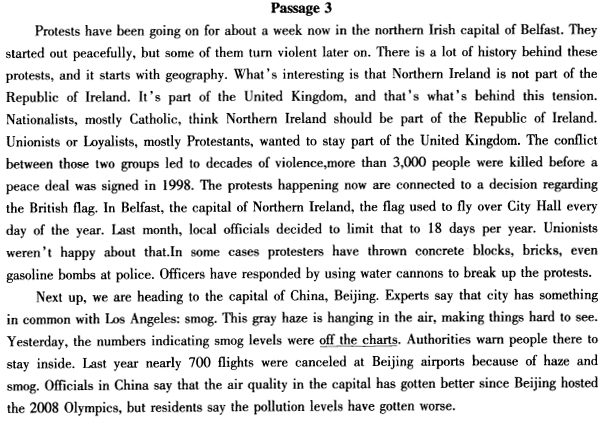 本题解释: 【答案】A。专家解析:根据题干关键词定位到第一段What’s interesting is that Northern Ireland is not part of the Republic of Ireland. It’s part of the United Kingdom, and that’s what’s behind this tension.(有趣的是:北爱尔兰不是爱尔兰共和国的一部分,它是英国的一部分,这就是贝尔法斯特紧张的原因。)因此,正确答案为A项“北爱尔兰不属于爱尔兰共和国”。B项“北爱尔兰计划脱离爱尔兰”,C项“北爱尔兰打算独立”和D项“爱尔兰是一个太过复杂的国家而难以统一”均不符合题意。