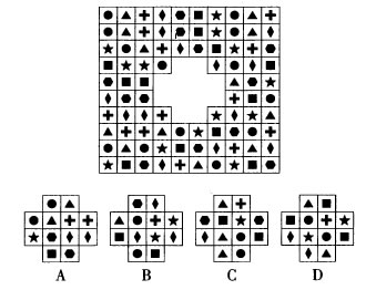 【答案】C。解析:从左上角开始,7种小图形顺次按顺时针方向螺旋排列。