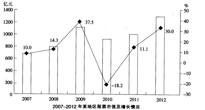 【答案】D。解析:股票市值同比增长率最髙的年份是2009年,该年股票市值约为1100亿元。