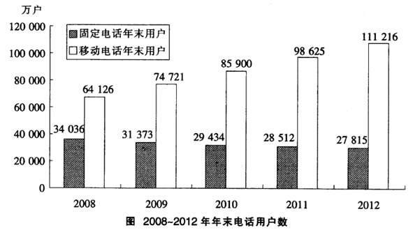 2012年我国全年完成邮电业务总量15 022亿元,比上年增长13.0%。其中,邮政业务总量2037亿元,增长26.7%;电信业务总量12 985亿元,增长11.1%。年末固定电话用户27 815万 户,其中,城市电话用户18 893万户,农村电话用户8 922万户。新增移动电话用户12 591万 户,年末达到111 216万户。年末全国固定及移动电话用户总数达到139 031万户,比上年末增 加11 896万户。电话普及率达到103.2部/百人。互联网上网人数5.64亿人,其中宽带上网人数 5.30亿人,互联网普及率达到42.1%。