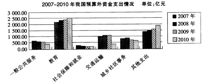 【答案】B。专家解析:由图中条形长度可推知,2007至2010年我国预算外资金支出中最大项目支出是教育,应选择B。