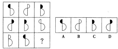 【答案】D。专家解析:将每个图形分为上下两部分,每行/列的图形中上半部分组成元素均相同,观察发现问号处缺少黑色图形,而每行/列图形中的下半部分均有一个向左、两个向右的半圆,问号处缺少向左的半圆。故答案选D。