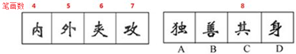 参考答案: C 本题解释: 【解析】C。已知图形中各个字的笔画数分别为4、5、6、7,那么接下来一个字的笔画数应该为8。故正确答案为C。