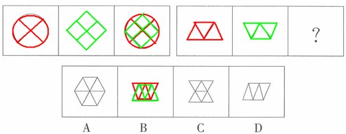参考答案: B 本题解释:B【解析】前四个图形分别都只由两个形状相同的图形构成,A选项为三个形状相同的图形,排除;C、D选项除两个形状相同的图形外,还有其他图形;B选项正确。