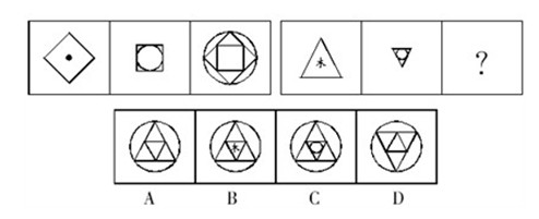 9、图形推理。每道题包含两套图形和可供选择的4个图形。这两套图形具有某种相似性,也存在某种差异,要求你从四个选项中选择你认为最适合取代问号的一个。正确的答案应不仅使两套图形表现出最大的相似性,而且使第二套图形也表现出自己的特征。