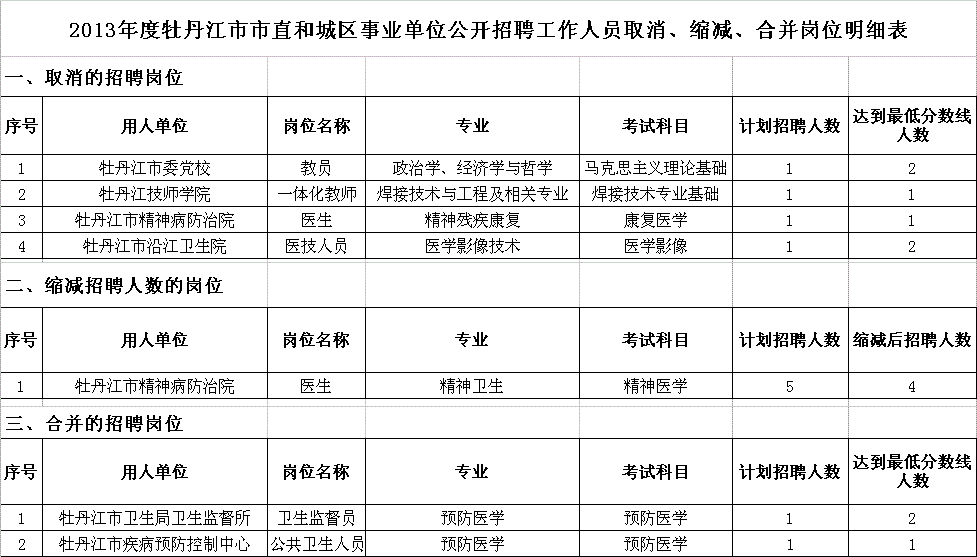 2013年度牡丹江市市直和城区事业单位公开招聘工作人员笔试已结束,经牡丹江市机关事业单位招聘工作领导小组研究,对通过笔试最低分数线的人数与招聘岗位人数比例未达到规定面试1:3比例,且不能进行缩减、合并、调剂的岗位予以取消;缩减或合并后仍达不到规定面试比例的进行调剂。具体事项公告如下:
