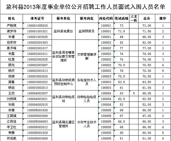 2013年12月湖北荆州监利县事业单位招聘面试入围人员名单