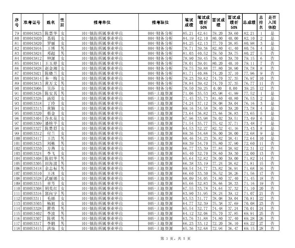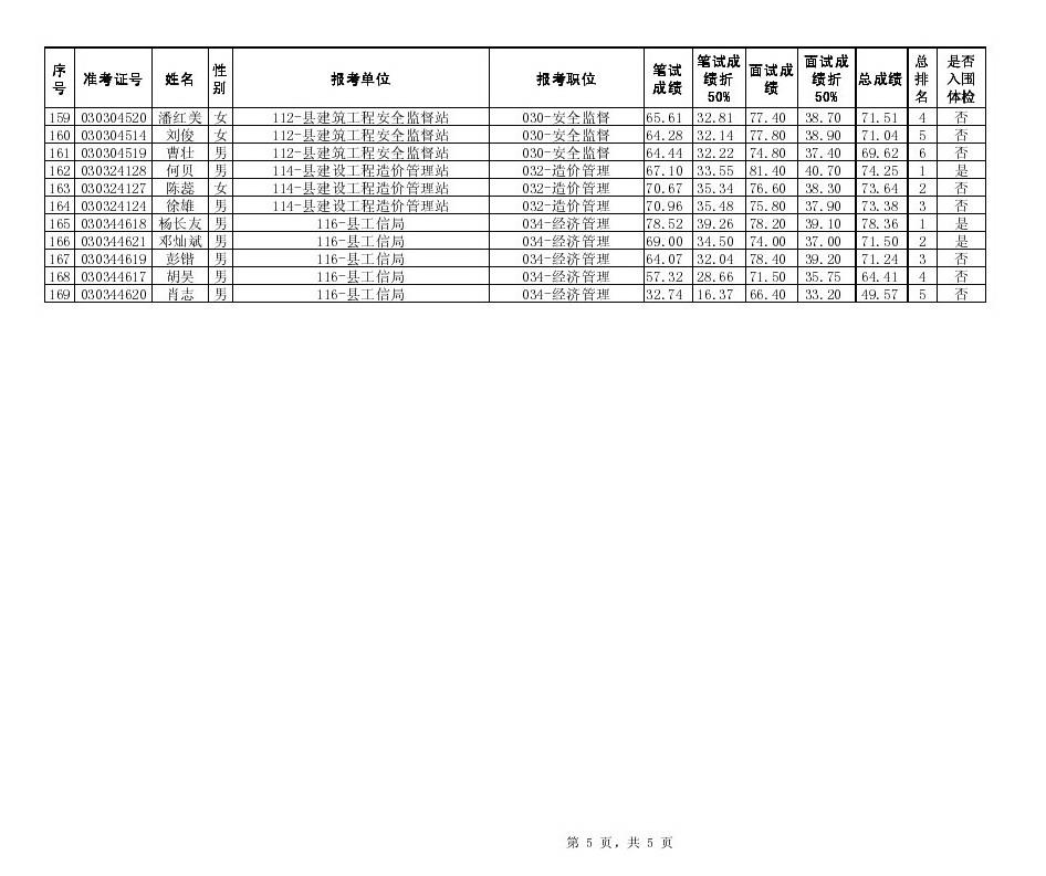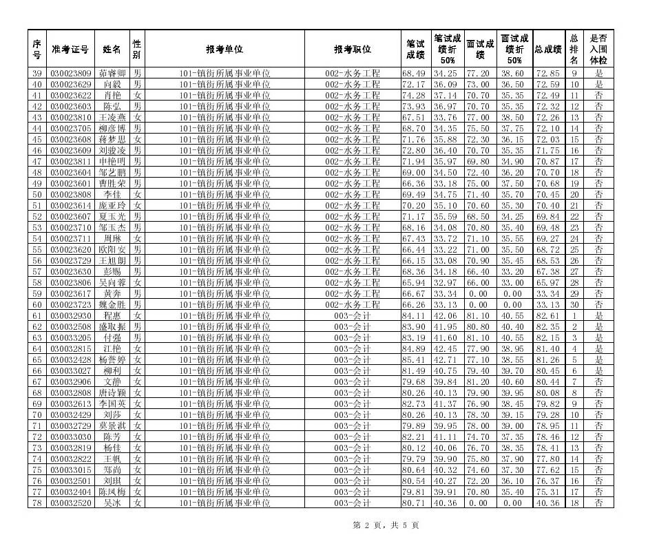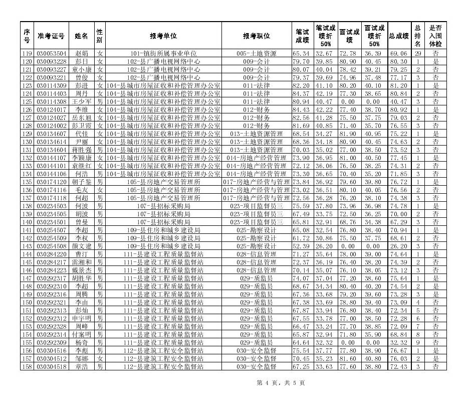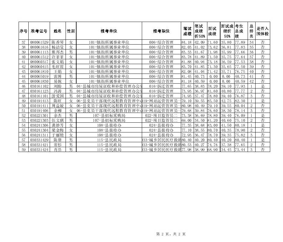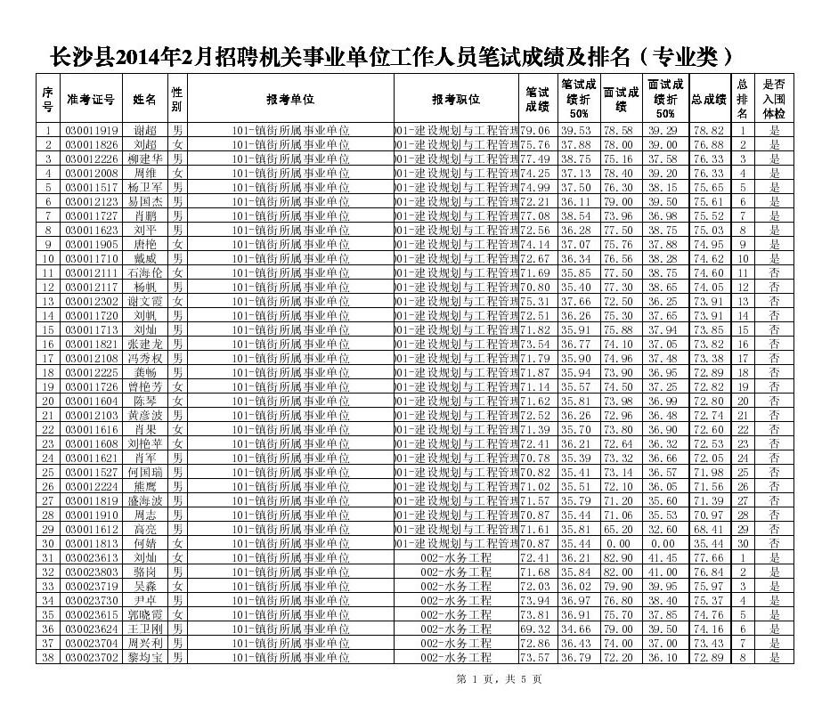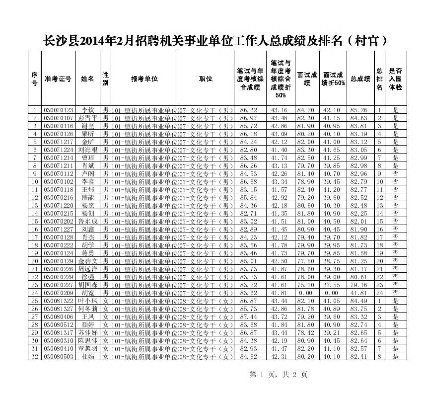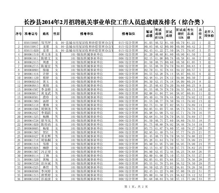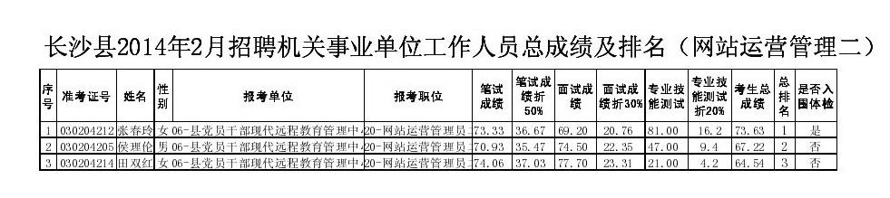 长沙县2014年2月招聘机关事业单位工作人员笔试面试总成绩、入围体检人员名单公示