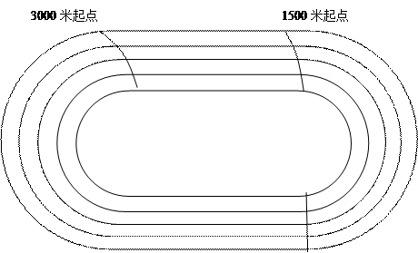 在400米标准田径场跑道上标出弧形起跑线和终点线,在起跑线后3米处标出集合线。3000米、1500米跑均为不分道跑。