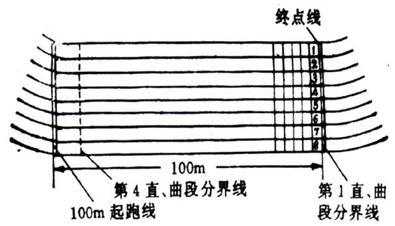 在长100米的跑道上,标出起跑线和终点线,在起跑线后3米处标出集合线。此项目为分道跑。