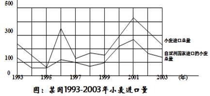 解析:从1993年到1997年共计5个年份,根据图示,该国共从亚洲国家进口小麦约为450百万吨;该国小麦进口量曲线在200百万吨以上的年份共有六个,故题2答案为C;题3问该国在哪一年,自亚洲以外其他国家进口的小麦数量最多,根据题意:小麦进口总量减去自亚洲国家进口小麦总量即为自亚洲以外其他国家进口的小麦数量,由图可见1996年该值为最大,故答案为D。