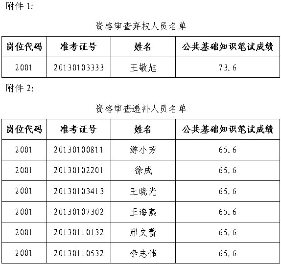 2013年最新招考信息: 来源:www.91exam.org 根据《2013年临淄区事业单位公开招聘工作人员公告》的规定,现将资格审查放弃及递补人员名单予以公告,请资格审查递补人员备齐相关材料,按规定参加资格审查。