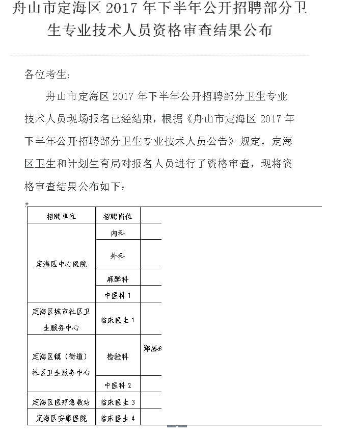 舟山市定海区2017年下半年公开招聘部分卫生专业技术人员现场报名已经结束,根据《舟山市定海区2017年下半年公开招聘部分卫生专业技术人员公告》规定,定海区卫生和计划生育局对报名人员进行了资格审查,现将资格审查结果公布如下:见附件
