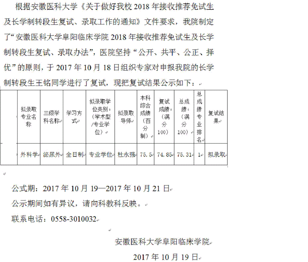 2017年10月2018安徽阜阳市人民医院安医大长学制转段生拟录名单公示_^91考试网网