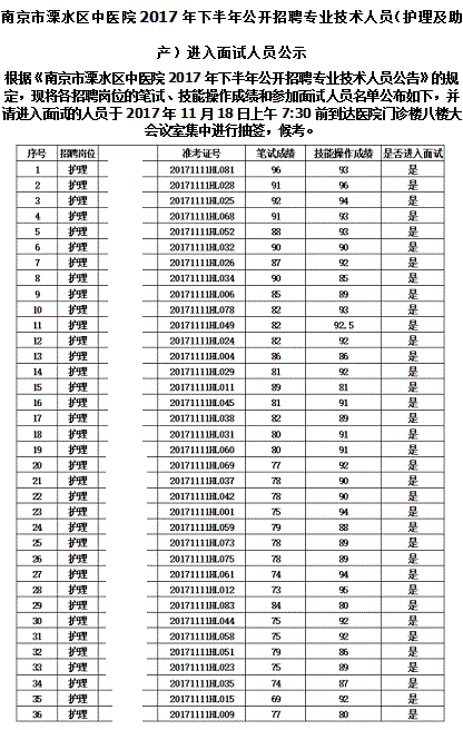 根据《南京市溧水区中医院2017年下半年公开招聘专业技术人员公告》的规定,现将各招聘岗位的笔试、技能操作成绩和参加面试人员名单公布如下,并请进入面试的人员于2017年11月18日上午7:30前到达医院门诊楼八楼大会议室集中进行抽签,候考。