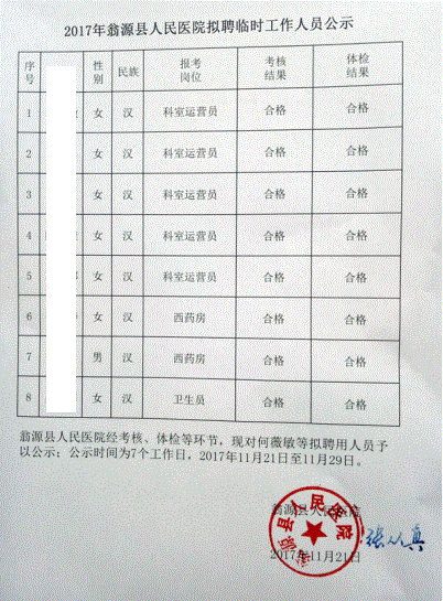 2017年11月广东翁源县人民医院临时工作人员招聘拟聘公示