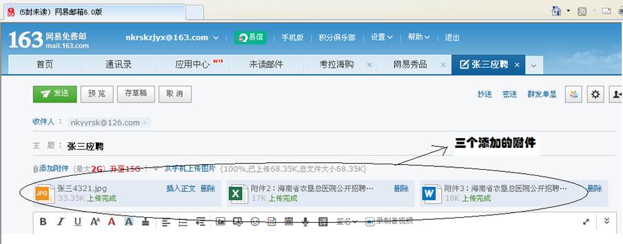 2.将本人照片、已经填好的附件2《海南省农垦总医院公开招聘编外人员报名信息表》、附件3《海南省农垦总医院公开招聘编外人员资格审查目录表》以电子邮件的形式,分别添加到电子邮件的附件中(见下图)。请不要将三个文件压缩打包,切记!!