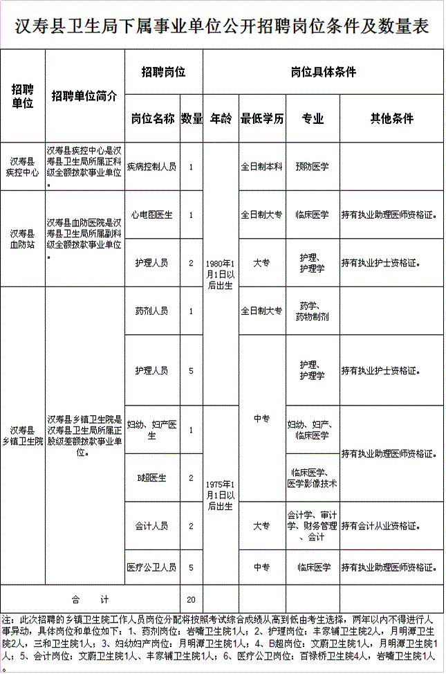 我县拟面向社会公开招聘县直医疗卫生单位和乡镇医院工作人员20名,凡符合报名条件人员均可报名应聘。