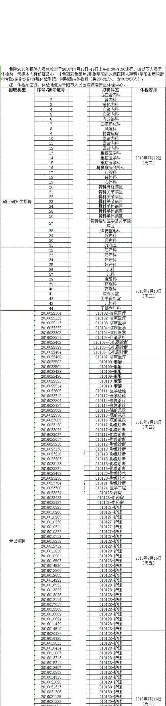 原标题:阜阳市人民医院2016年招聘人员体检安排