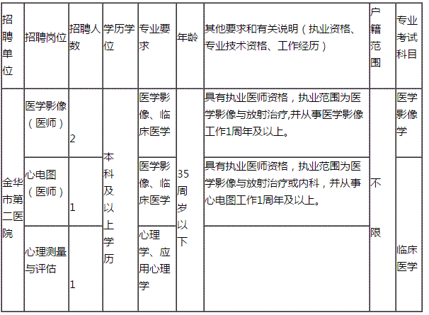 金华市直卫生系统事业单位于2016年9月8日发布在金华人才网公开招聘工作人员的公告,报名截止日期为2016年9月23日,根据报名和资格审查情况,其中金华市第二医院的医学影像(医师)、心电图(医师)、心理测验与评估3个岗位合格报名人数不足最低开考比例,根据用人单位工作实际需要,现将有关招 聘补充具体事项通知如下:(详见附件)