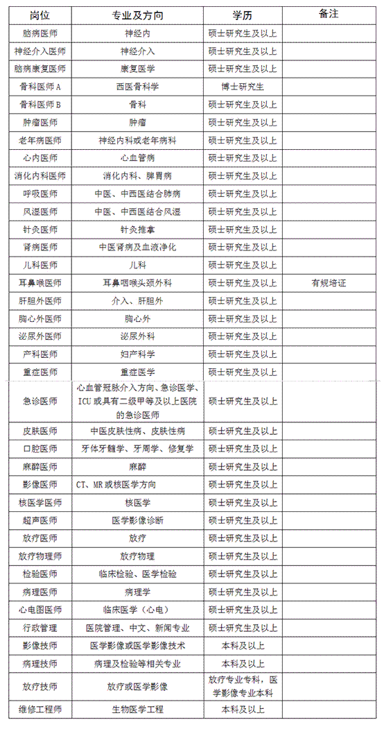 备注:学历要求为国家正规院校全日制学历;岗位要求有医师资格证的(除七年制或特殊情况除外),执业范围应于岗位要求一致;学历高于岗位要求的人员可以报考该岗位,应聘岗位有学位要求的,报名人员应当具有相应或更高学位;有规培证者、工作经验者优先。