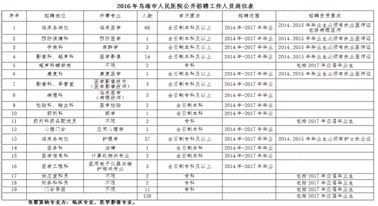 本次公开招聘工作人员共158名,具体岗位详见附件《2016年乌海市人民医院公开招聘工作人员岗位表》(以下简称《招聘岗位表》)。