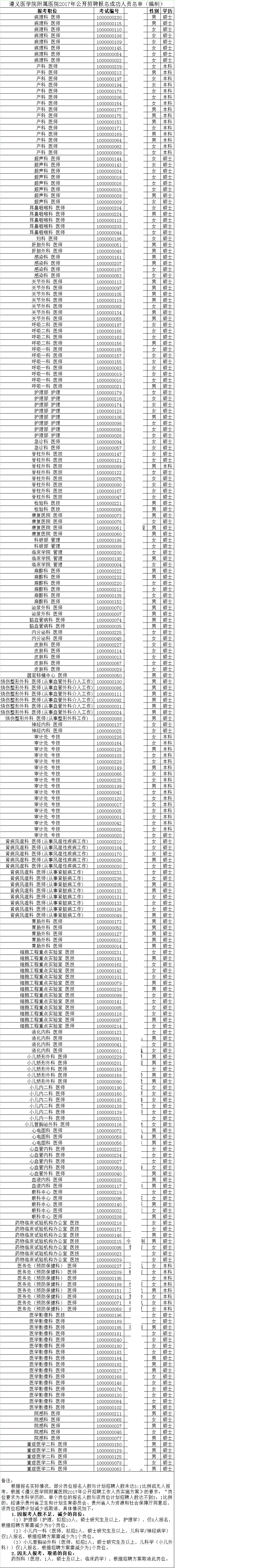 2017年遵义医学院附属医院 招聘报名成功人员名单(编制)