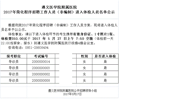 原标题:遵义医学院附属医院2017年简化程序招聘工作人员(非编制)进入体检人员名单公示