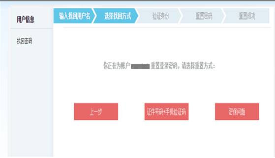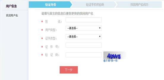 1.输入用户名:输入用户名和验证码,点“下一步”进入选择找回方式页面。