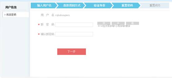 4.重置密码:用户名(默认),依次输入新密码、确认新密码,两个密码校验一致后,点击“下一步”,密码重置成功。