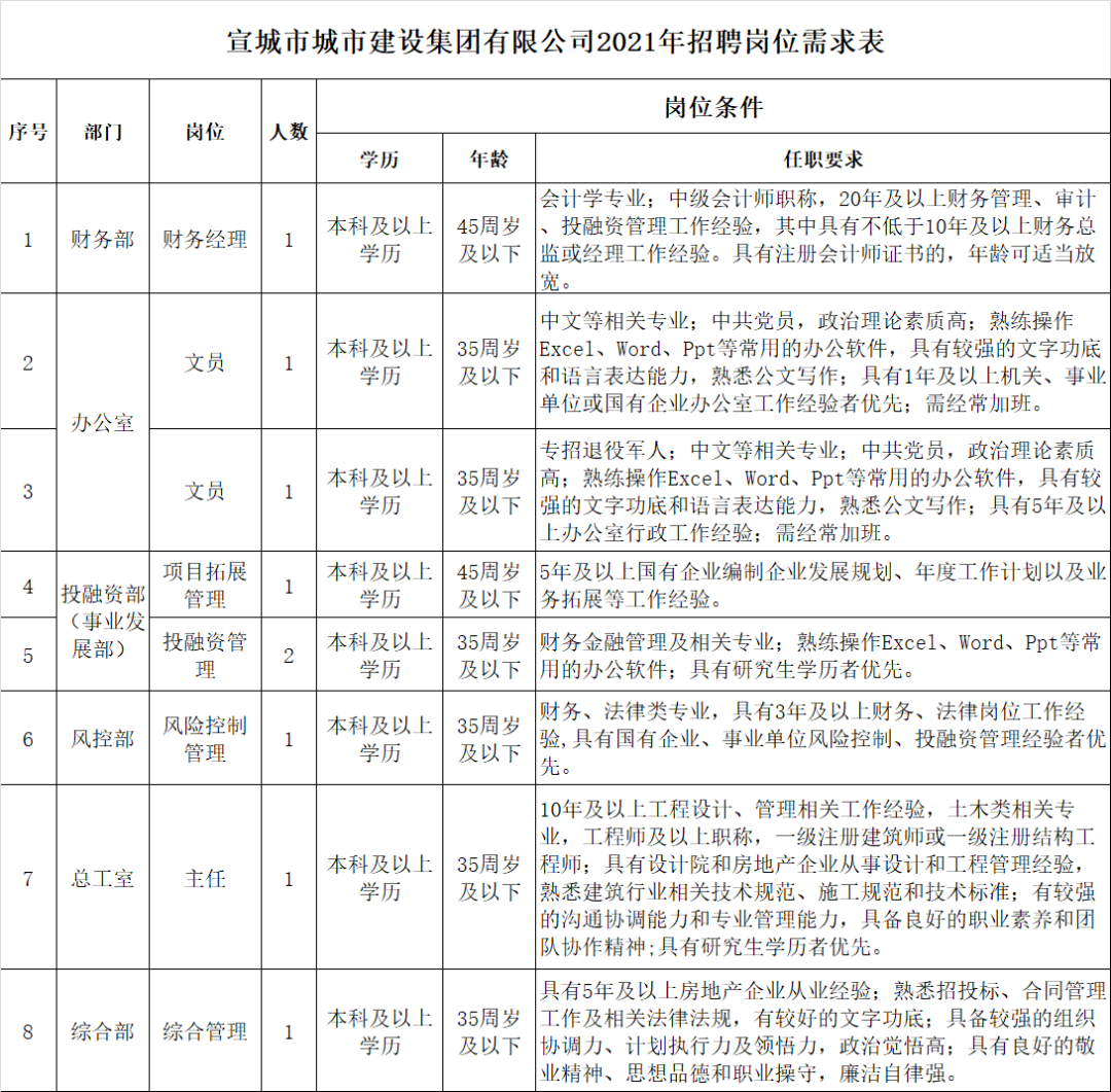 本次计划招聘正式员工9名,其中:财务部经理1名,办公室文员2名,投融资部(事业发展部)项目拓展管理1名、投融资管理2名,风控部风险控制管理1名,总工室主任1名,综合部综合管理1名。招聘岗位及基本要求见附件《宣城市城市建设集团有限公司招聘岗位需求表》。人员招聘按照1:3的比例竞争比选,如一个岗位不满3人参与竞争比选,则该岗位招聘取消。