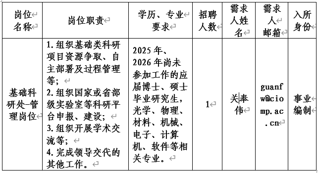长春光机所以建成国际一流的精密仪器与装备创新研究基地为目标,紧紧围绕国家重大科技需求和关键核心技术突破,聚焦光电技术创新,不断拓域前行。根据本所需求,招聘基础科研处工作人员岗位,详情如下:
