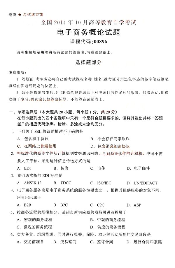 全国2014年10月自学考试《电子商务概论》真题(打印word版)(一)