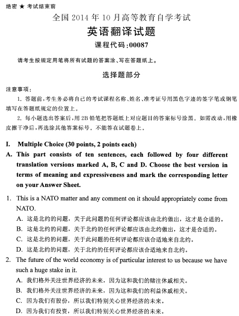 全国2014年10月高等教育自学考试英语翻译真题(打印word版)(一)