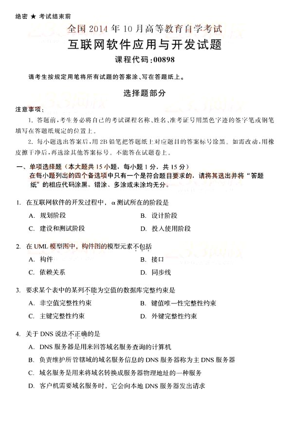 全国2014年10月自学考试《互联网软件应用与开发》真题(完美word版)(一)
