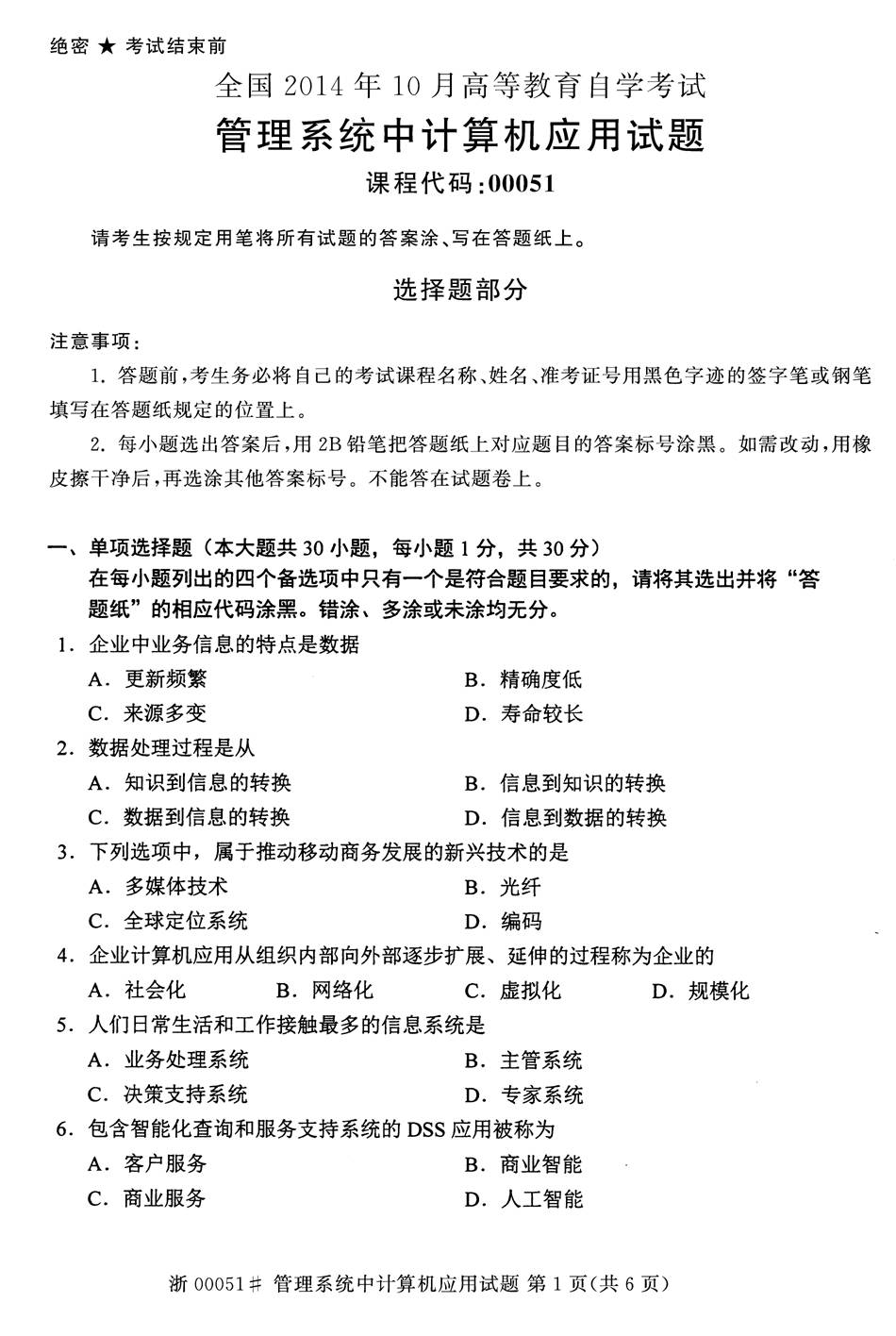 全国2014年10月高等自学考试管理系统中计算机应用真题(word下载版)(一)