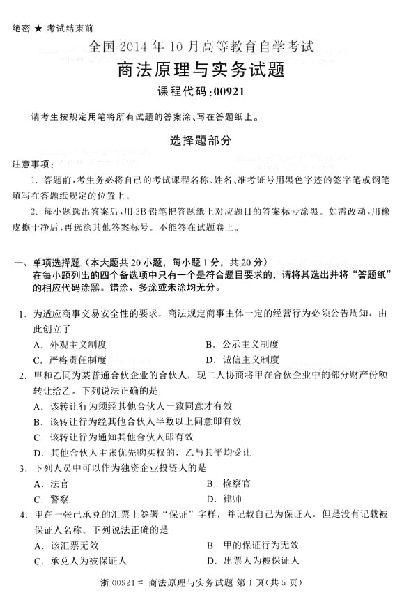 全国2014年10月高等教育自学考试《商法原理与实务》真题(完美word版)(一)