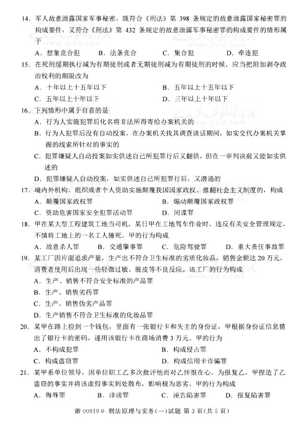 全国2014年10月自学考试《刑法原理与实务(一)》真题(word下载版)(三)