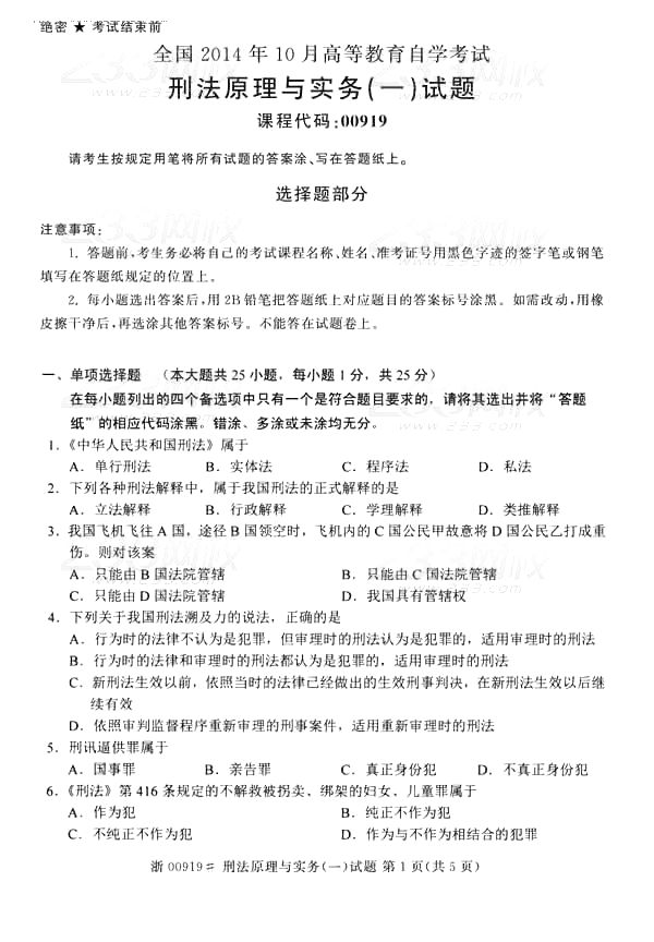 全国2014年10月自学考试《刑法原理与实务(一)》真题(word下载版)(一)