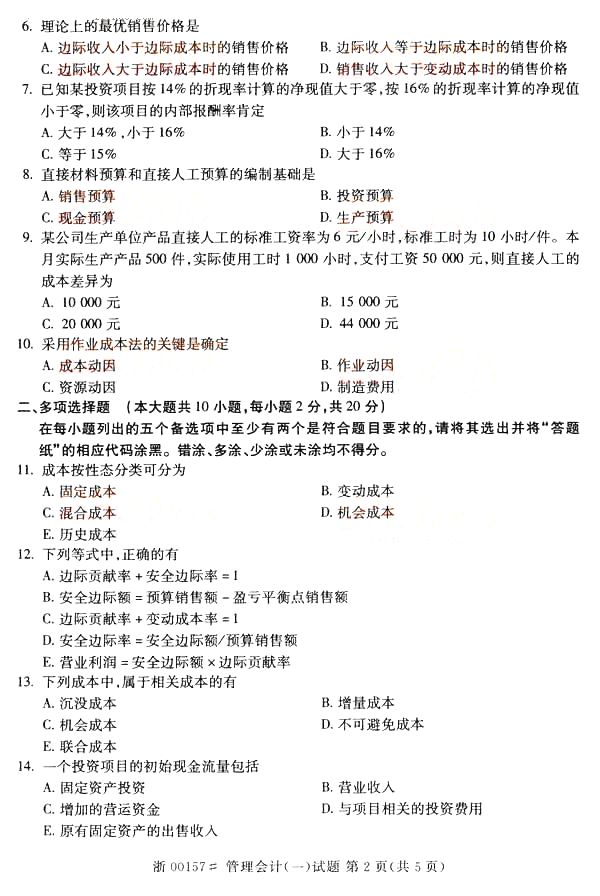 全国2014年10月自学考试《管理会计(一)》真题(打印word版)(二)