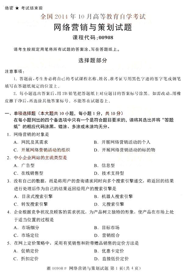 全国2014年10月自学考试《网络营销与策划》真题(完整word版)(一)
