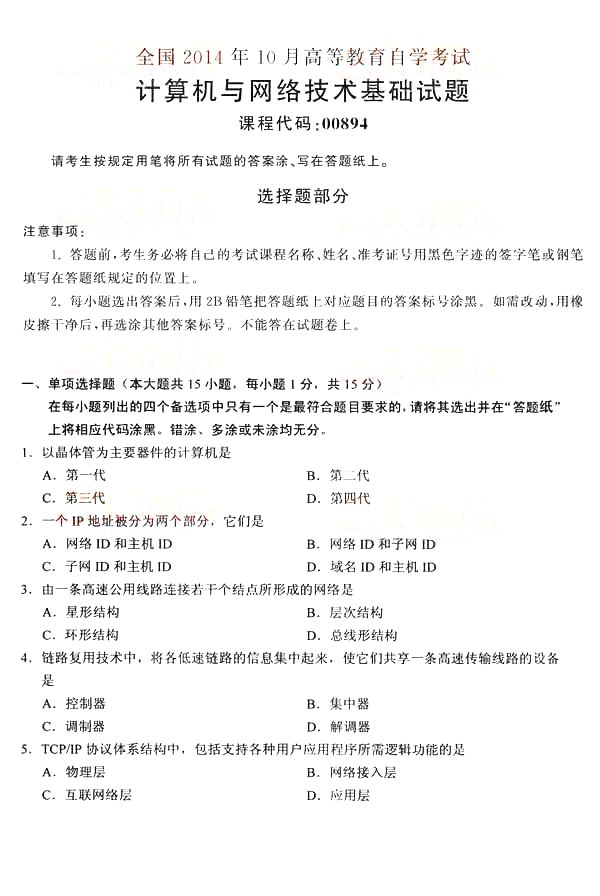 全国2014年10月自学考试《计算机与网络技术基础》真题(清晰word版)(一)