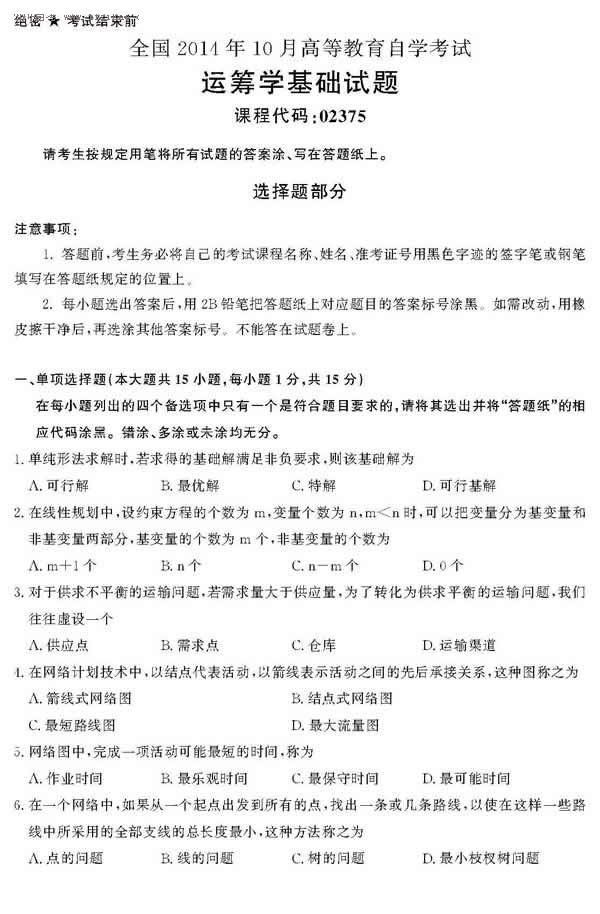 全国2014年10月自学考试《运筹学基础》真题(word下载版)(一)
