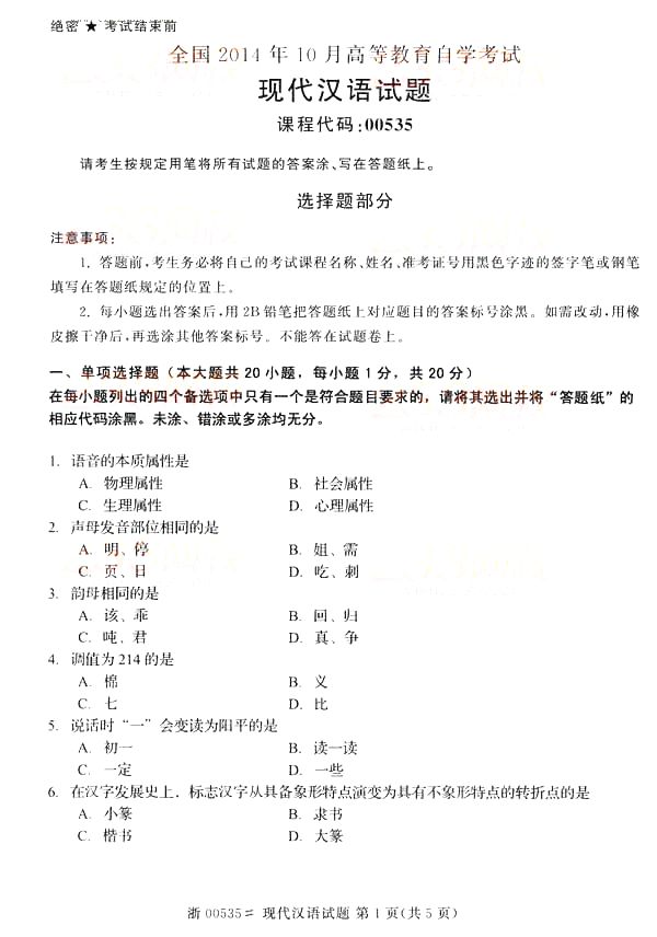 全国2014年10月自学考试《现代汉语》真题(word下载版)(一)