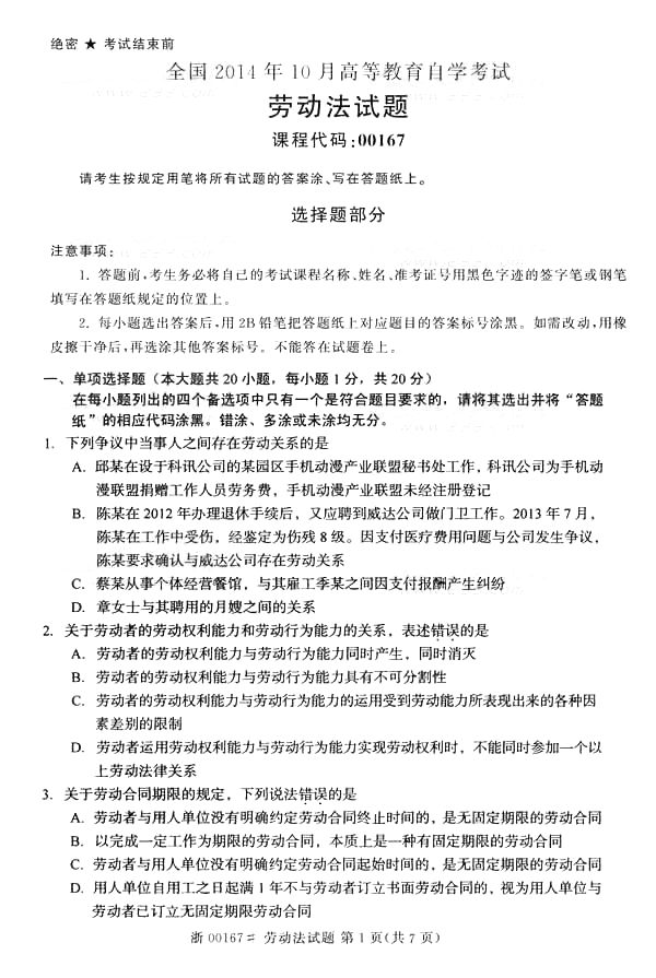 全国2014年10月自学考试《劳动法》真题(清晰word版)(一)